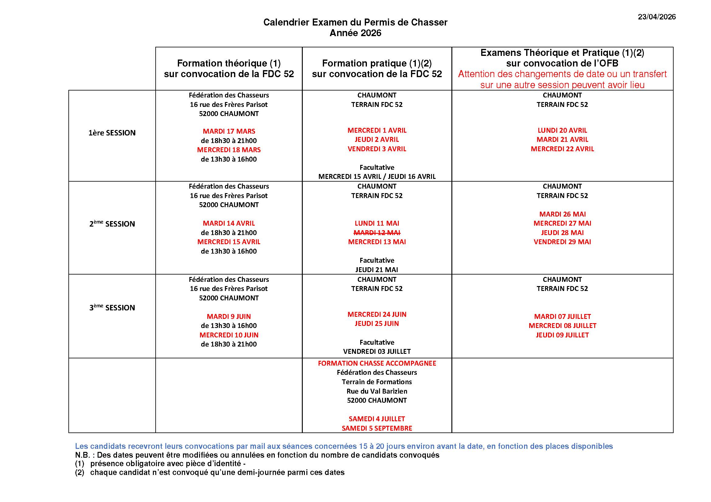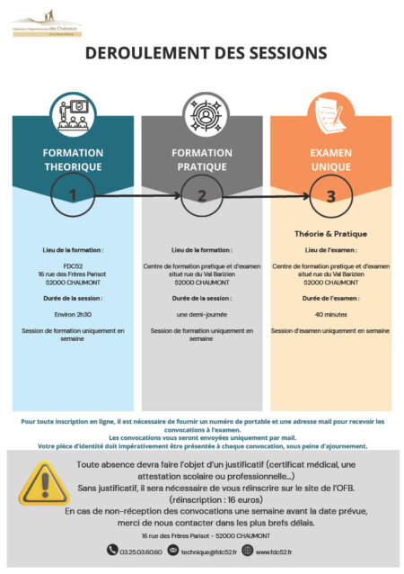 Les convocations aux formations théorique et pratique vous seront adressées par mail par la FDC une quinzaine de jours avant.