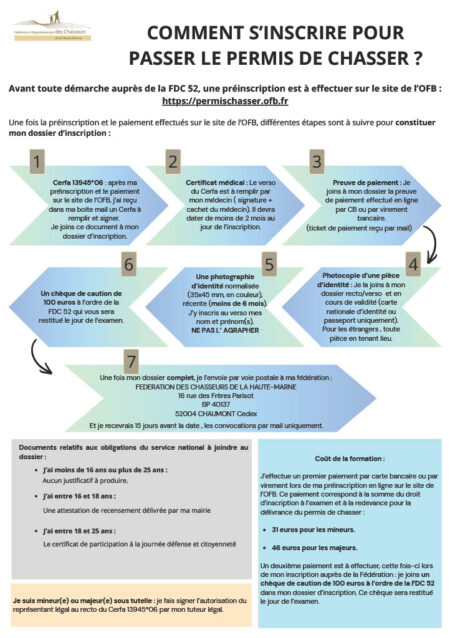 Le paiement se fera en ligne soit par carte bancaire (recommandé), soit par virement (le RIB de l’OFB est téléchargeable). Le montant est de 46 € pour les personnes majeures et 31 € pour les personnes mineures. Vous devrez télécharger le CERFA d’inscription qui sera prérempli et ensuite impérativement finaliser la demande d’inscription au permis.